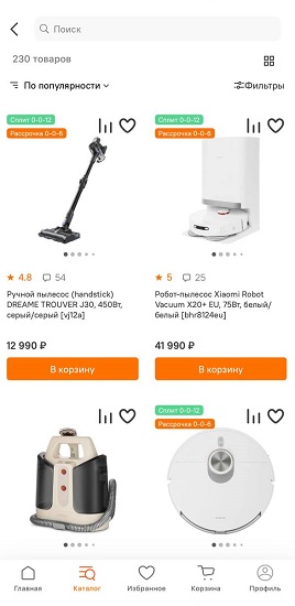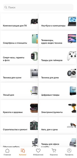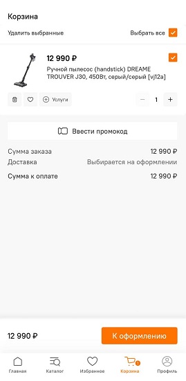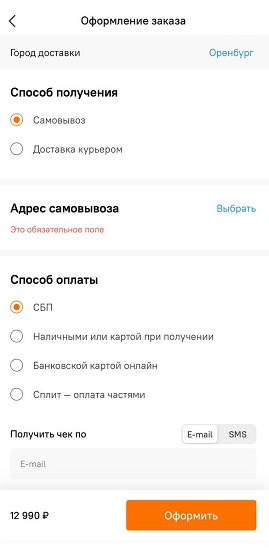 Функционал повторяет сайт. Здесь также доступен выбор товаров, оформление заказа, оплата и отслеживание статуса.